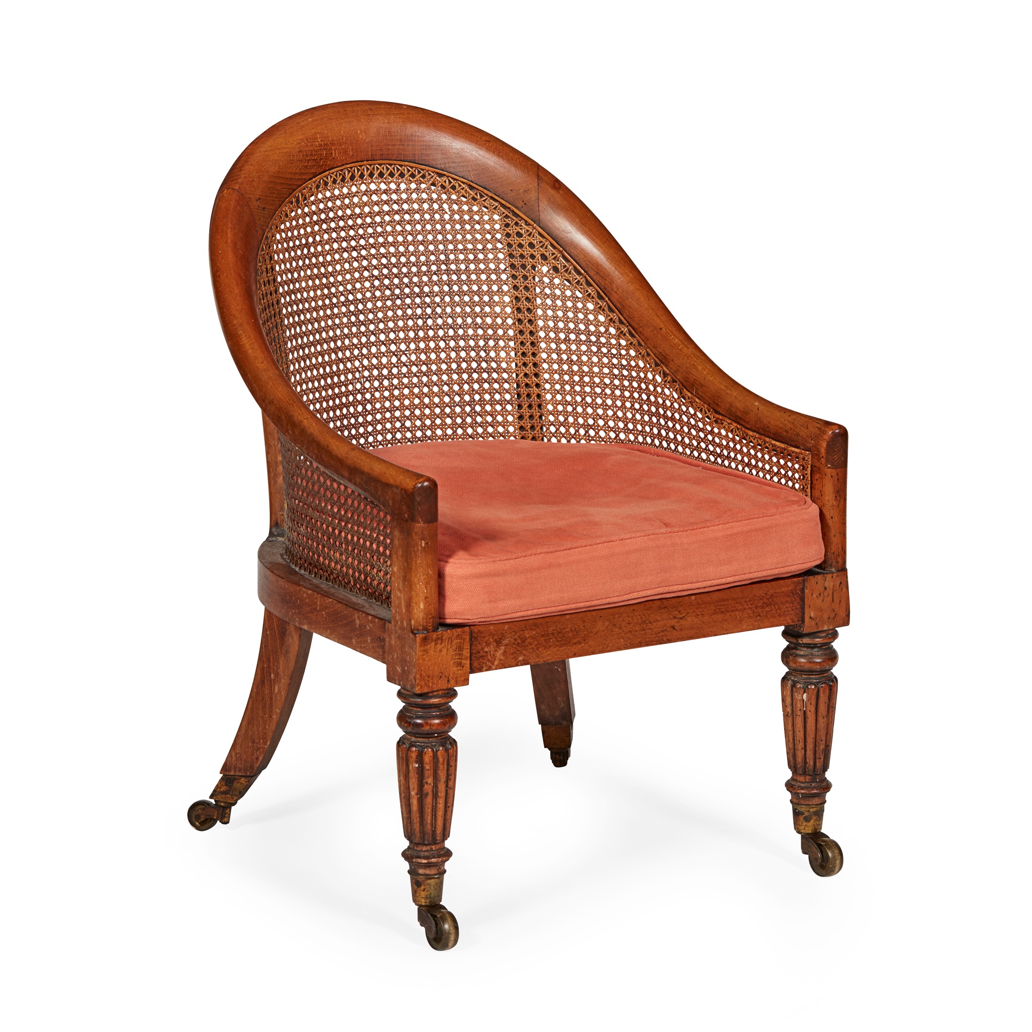 of neat size, with a caned back and seat, raised on reeded tapered legs with brass caps and castors, the loose cushion covered in salmon pink fabric