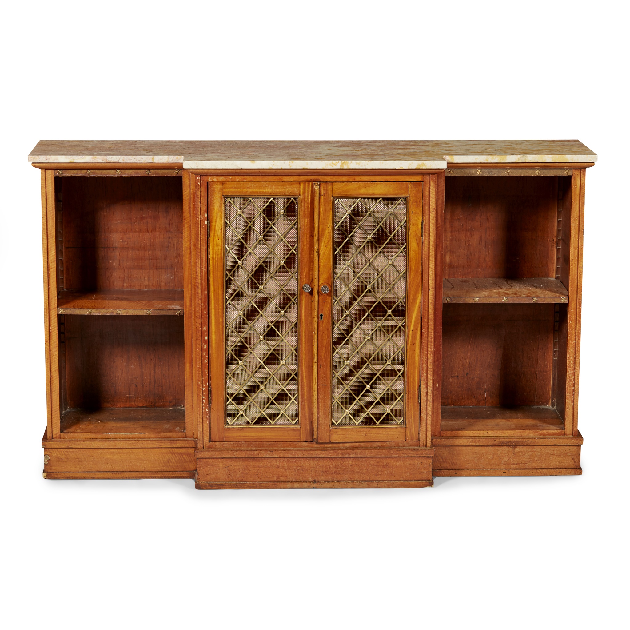 the later breakfront marble top above a central pair of grille and wire mesh insert doors opening to shelves, flanked by open shelves mounted with brass stars, on a plinth base