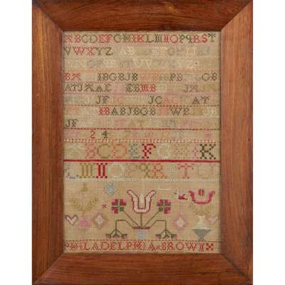 the bands worked with three alphabets, a number series and five bands of family initials, above a field with tulips in pots, birds, hearts, and diamonds; in a period rosewood frame