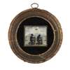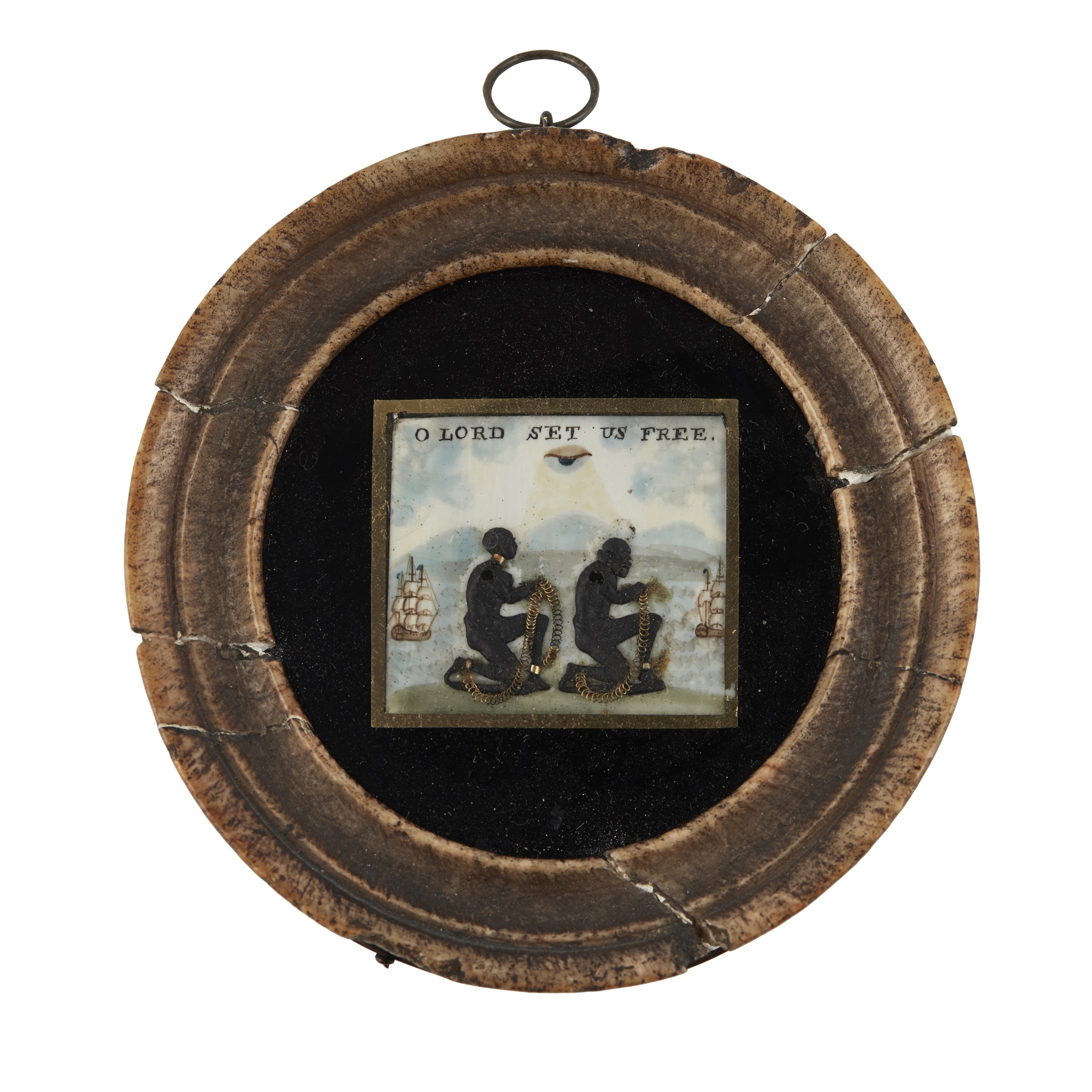 the rectangular panel depicting two relief figures of kneeling Africans in metal chains, beneath the motto 'O LORD SET US FREE' and a watchful eye, with two slave ships in the distance, set in a circular eglomise mount and moulded alabaster frame