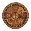 the circular top inlaid with a variety of exotic specimen wood veneers in eight sections inlaid with a cornucopia, a star motif, a heraldic shield, a vase of flowers, a musical trophy, a rose and thistle spray, and two panels of diaper pattern, within bands of flowerheads and doves, on a lotus carved column and quadriform base inlaid with a floral garland, diamond motifs and a band of thistles and acorns, on turned bun feet