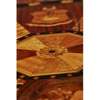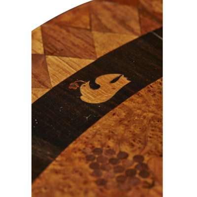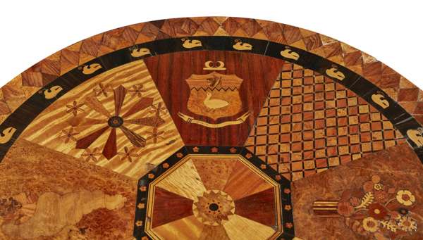 The Turnbull style is particularly idiosyncratic, not for the forms employed, but for the lavish use of exotic veneers, many of Jamaican origin, and the use of marquetry to embellish the surfaces. A number of small boxes bearing Ralph Turnbull’s trade label survive, some with handwritten paper keys identifying the various specimens used in the veneers. The present table features many of the traits recognised as the work of Ralph Turnbull’s workshop, and parallels can be seen between it and a labelled table currently in the collection of the Museum of Fine Arts Boston. The circular top is divided into eight panels, each containing geometric designs, tarsia geometrica, heraldic motifs, and pictorial images, enclosed by a border of doves. The pictorial elements include a cornucopia, a vase and flowers, a musical trophy, and a spray with thistles, roses, oak leaves, and clover. The concave quadriform base is decorated with floral marquetry, geometric bands, thistles and acorns. While the individual motifs may have specific significance, some of the meanings are unknown. The quality of the various patterns and marquetry is inconsistent, with the top sections notably finer than those around the base, indicating the table was made by more than one craftsman, with the more intricate and higher quality marquetry used on the most prominent feature, the tabletop. This is consistent with the MFA table, where the variations in quality apparently indicate some work was done by apprentices. The current table exhibits all the characteristics that point to pieces coming from the Ralph Turnbull and Sons workshop. Highly prized for their originality of design, execution, and rarity, furniture from the Turnbull workshop offer a valuable insight into the colonial period of Jamaica, and demonstrate a distinct identity and the uniqueness of Jamaican craftsmanship.