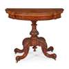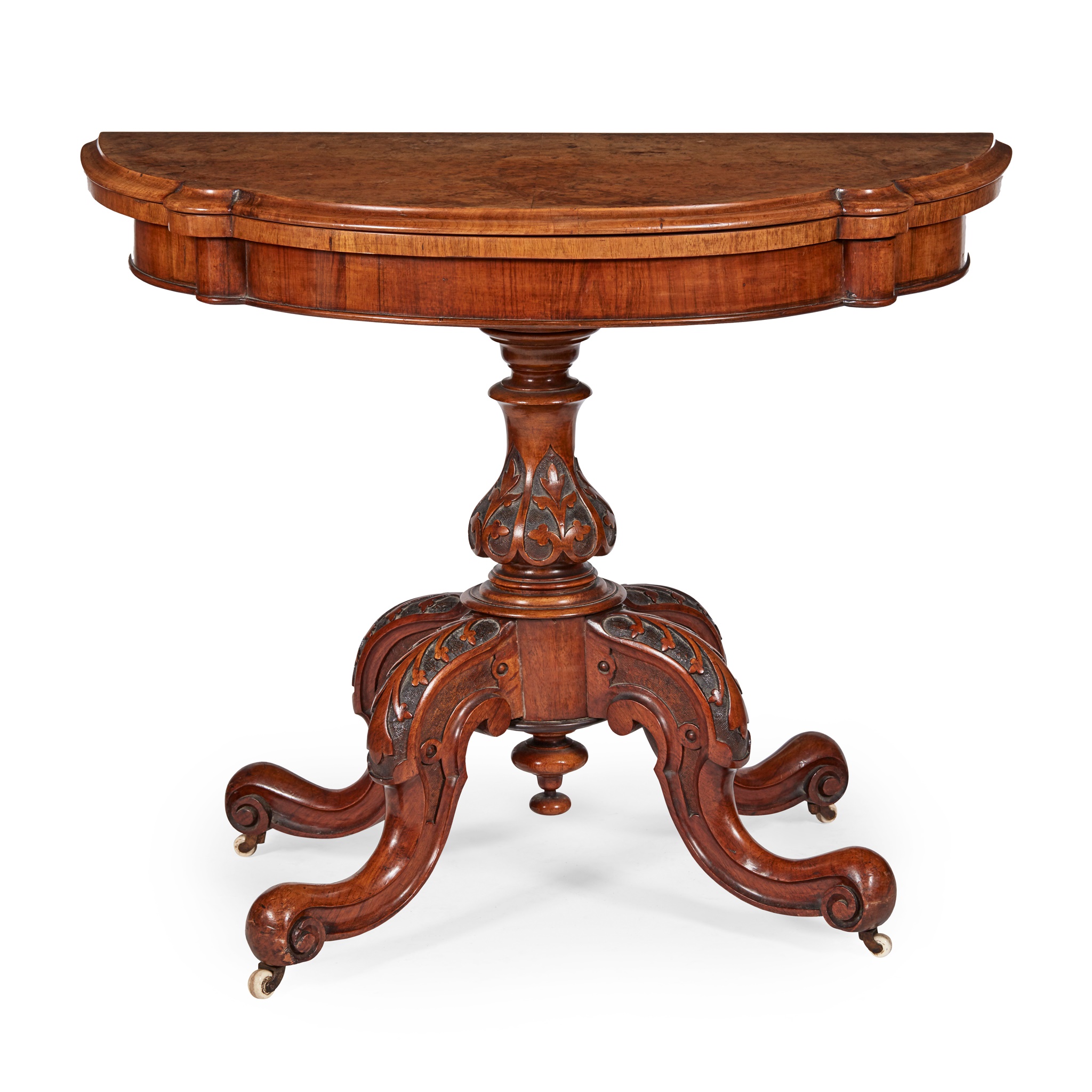 the shaped demilune fold-over top opening to a green baize playing surface, raised on a foliate carved baluster column and carved scroll legs with ceramic castors