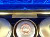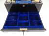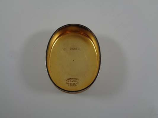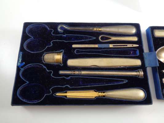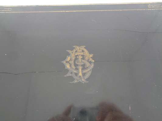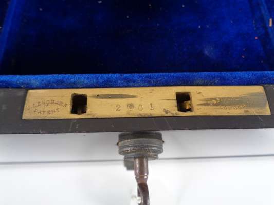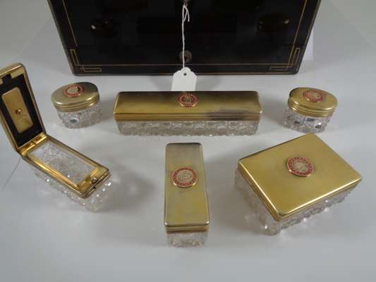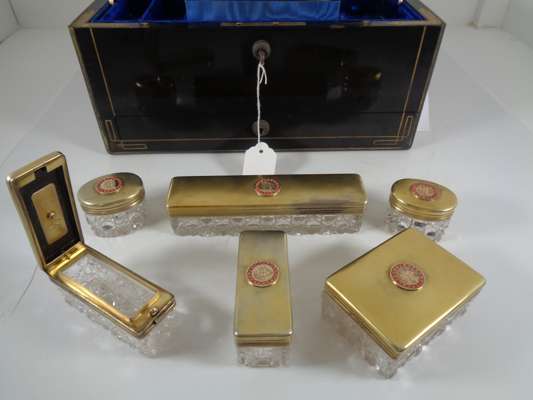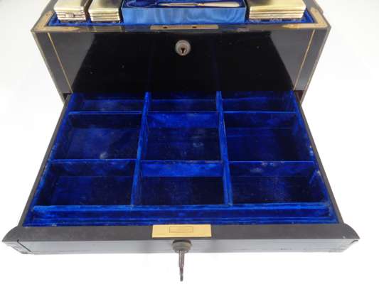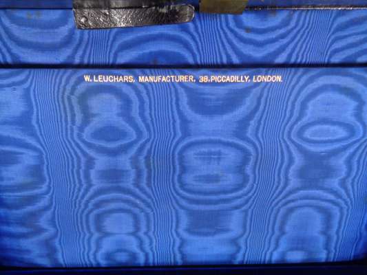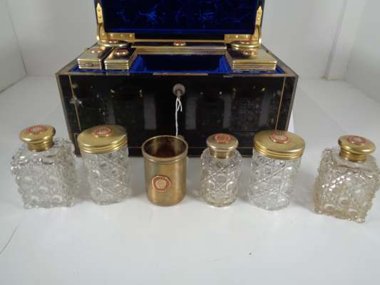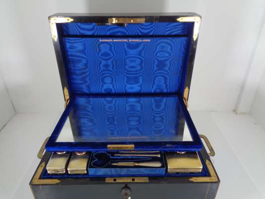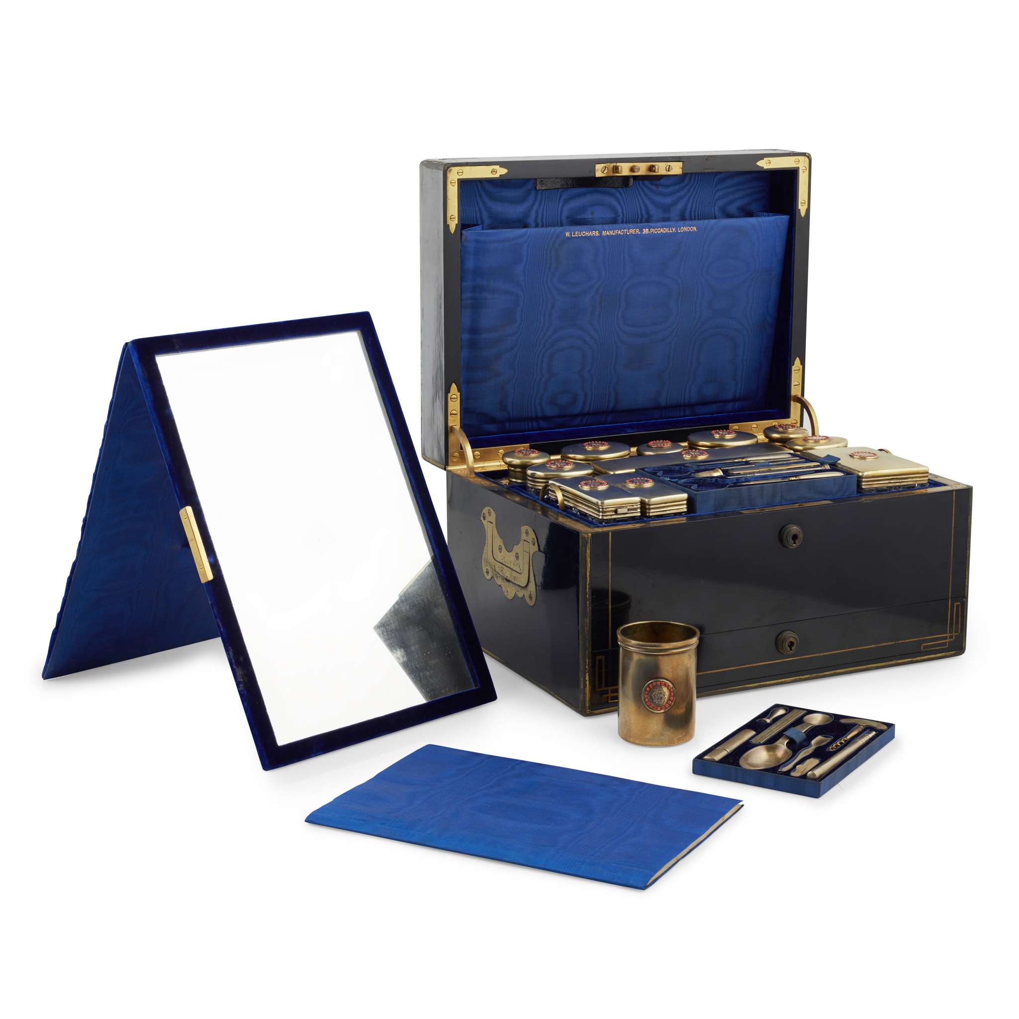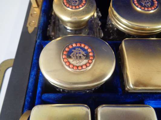 the brass banded case with brass monogram CB and recessed loop handles, opening to a blue velvet and silk lined interior fitted with trays, a mirror, various writing and toilet accessories, and cut glass bottles and boxes with silver-gilt lids with matching monogram enclosed by coral beads, the silver with marks for Thomas Johnson, London, 1869; name engraved locks and bearing an engraved plaque LEUCHARS & SON/ 38 & 39 Picadilly London W