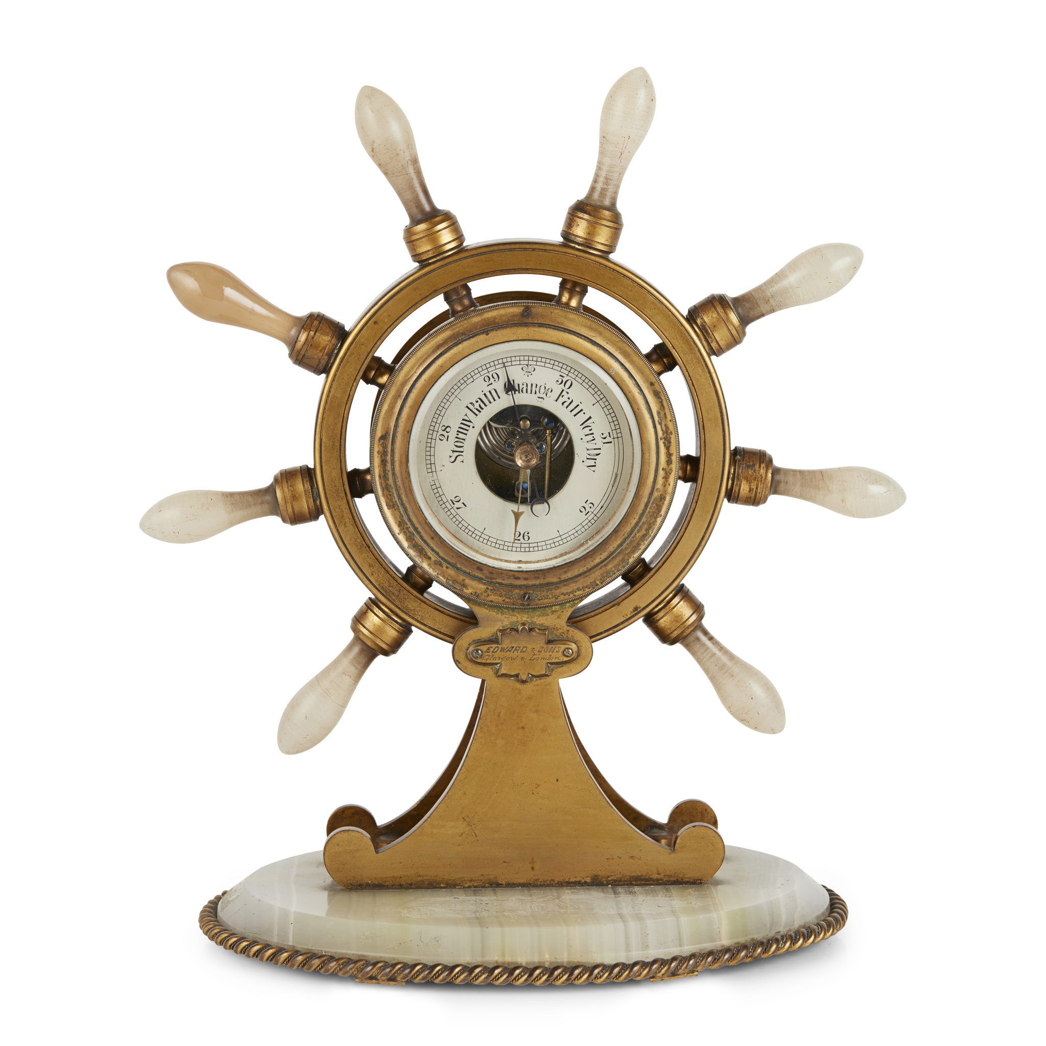 in the form of a ship's wheel with onyx handles enclosing a silvered dial, raised on a brass support with engraved plaque EDWARD & SONS./ GLASGOW & LONDON, on an oval onyx base with rope twist brass mounts