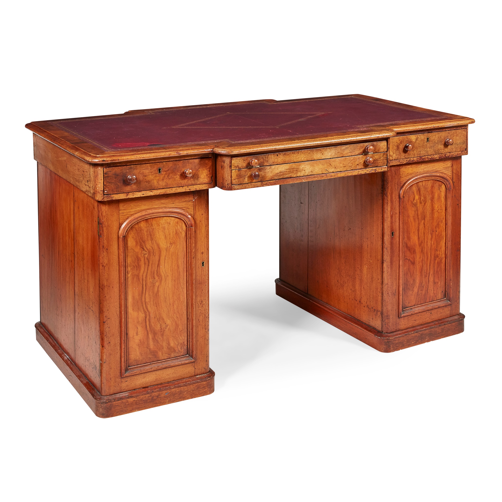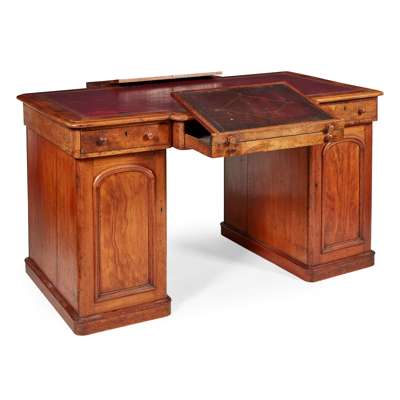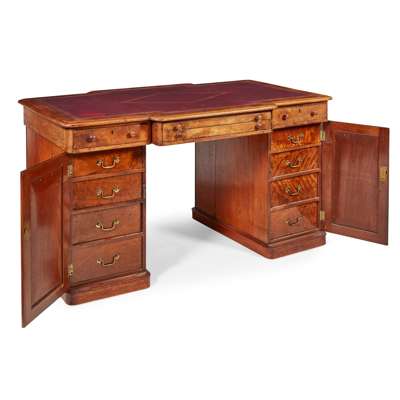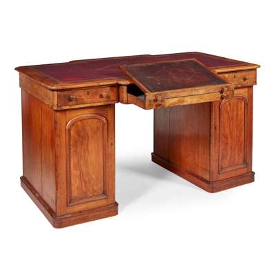 the shaped rectangular top with a red leather skiver, above three frieze drawers, the central drawer fitted with a writing slope, a further writing slope and dummy drawers opposing, raised on pedestals with arch moulded doors enclosing drawers, on plinth bases