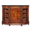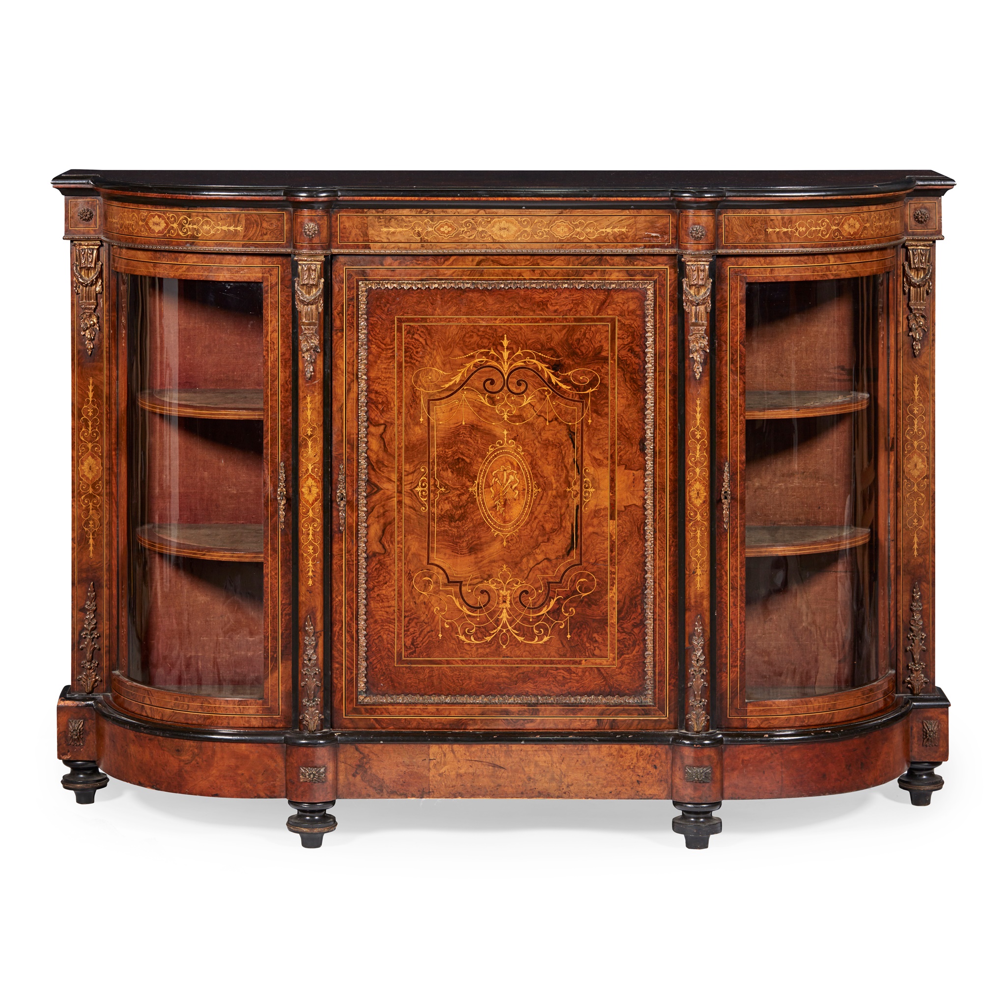 the shaped demilune top with an ebonised edge, above a central door inlaid wtih a musical trophy, foliate scrolls and line inlay, flanked by curved glazed doors enclosing shelves, flanked and divided by columns with gilt metal mounts, on a plinth base with turned ebonised feet
