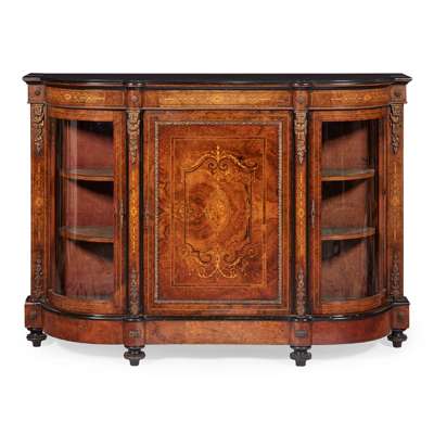 VICTORIAN WALNUT, EBONISED AND INLAY GILT METAL MOUNTED SIDE CABINET