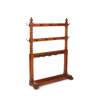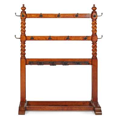 with three horizontal bars mounted with brass coat/hat hooks and stick holders, between spiral carved columns surmounted by urn finials, on a trestle base