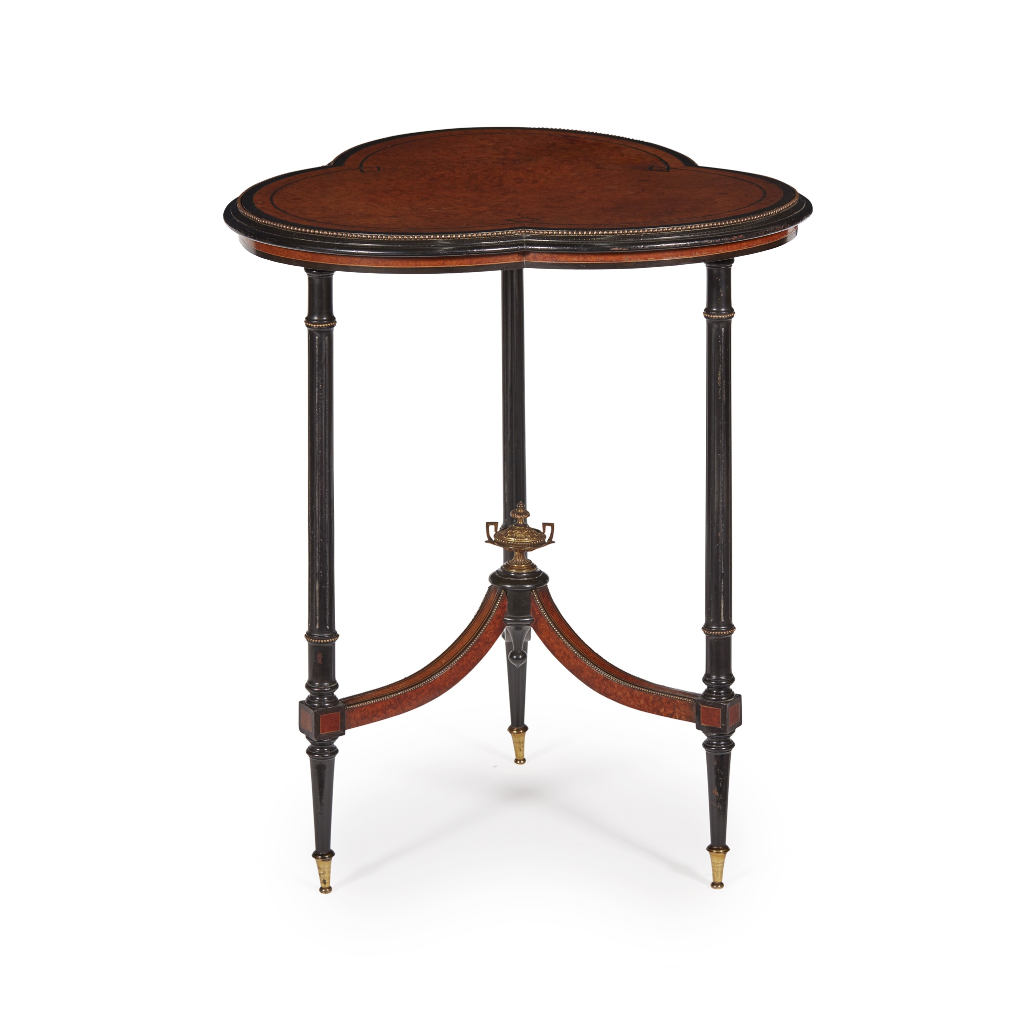 VICTORIAN AMBOYNA, EBONY AND BRASS MOUNTED OCCASIONAL TABLE