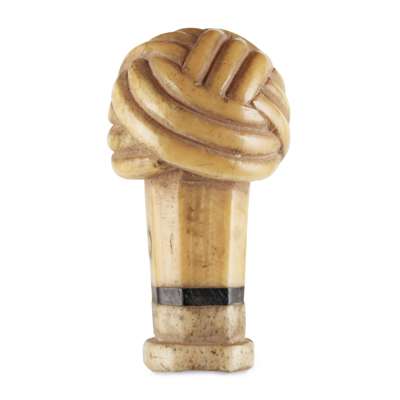 comprising whale jaw and whale tooth, with 'knotted' handle above the tapering shaft, with reeded, strawberry-cut and spiral carved panels