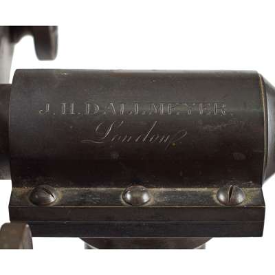 the signed tube with a lens cap, raised on a signed folding tripod stand and contained in a fitted box with further lenses