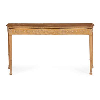the serpentine top with a moulded edge above a freize with three short drawers carved with foliate scrolls, flowerheads, and a central urn, on square fluted and tapered legs with foliate feet