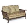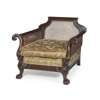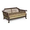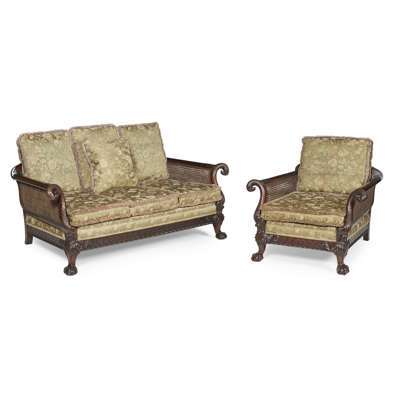 comprising a sofa and armchair, the low caned backs and enclosed arms with carved eagle's head terminals, above Vitruvian scroll carved seat rails, raised on claw and ball feet; with green foliate covered cushions