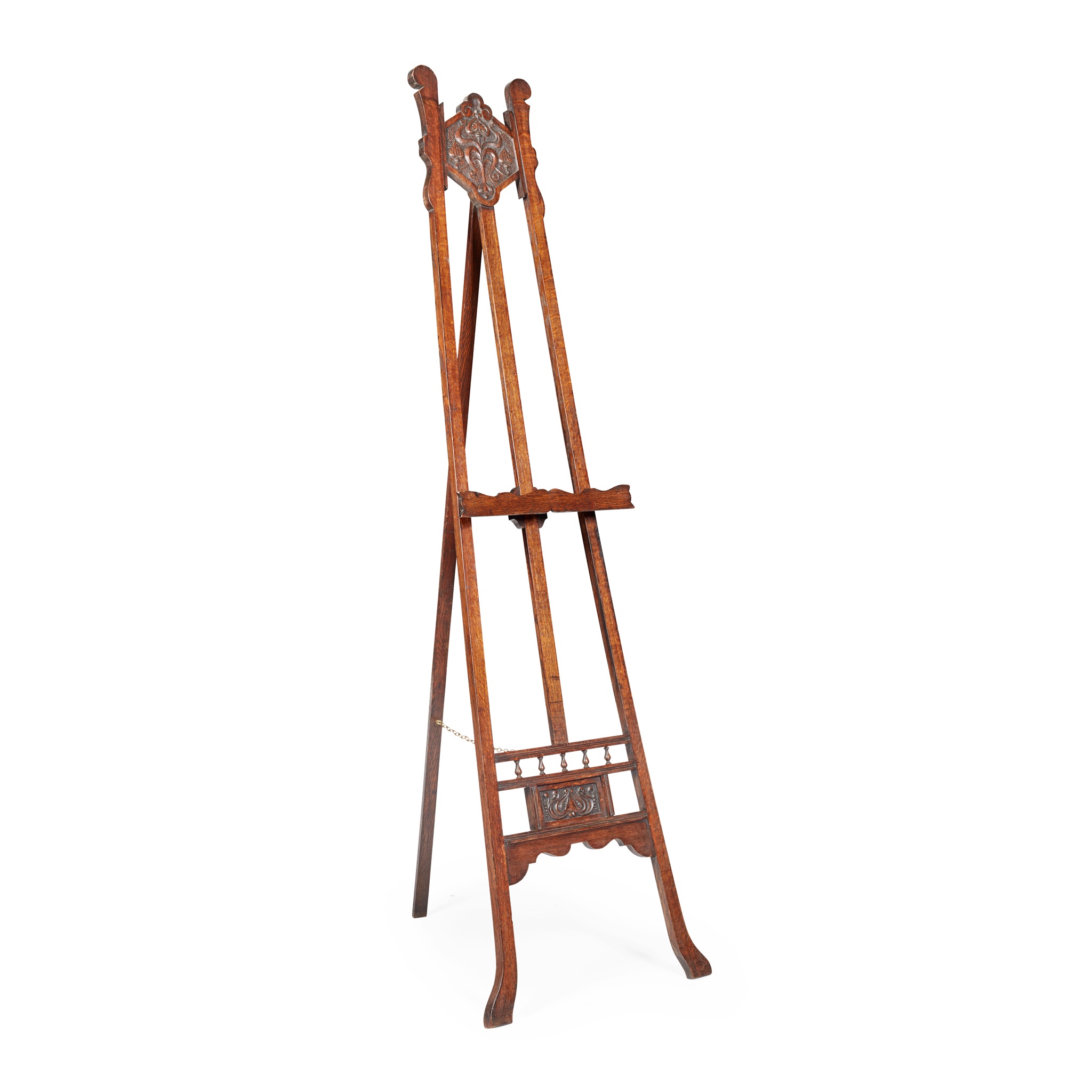 the centre panel carved with stylised plant-forms, above an adjustable gallery rail and easel supports