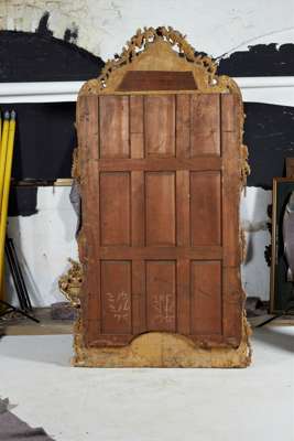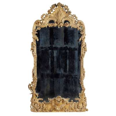 the shaped mirror plate in a frame carved with acanthus scrolls, flower garlands, and shell motifs