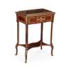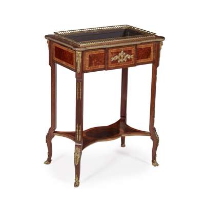 the brass gallery top with a lift out cover with floral marquetry, opening to a void interior above banded sides, raised on square legs joined by a shaped undertier and ending in sabots, the interior with a trade label