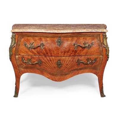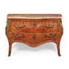 LOUIS XV STYLE KINGWOOD AND AMARANTH MARBLE TOPPED BOMBÉ COMMODE
