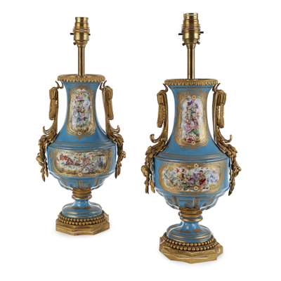 of baluster form decorated with reserves of courting couples, with flower bouquets to the reverse, on blue celeste grounds with gilt details, mounted with foliate gilt bronze handles, fitted for electricity