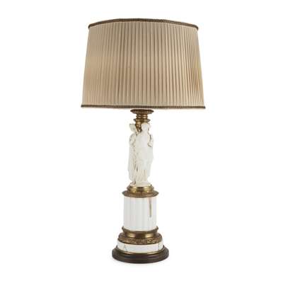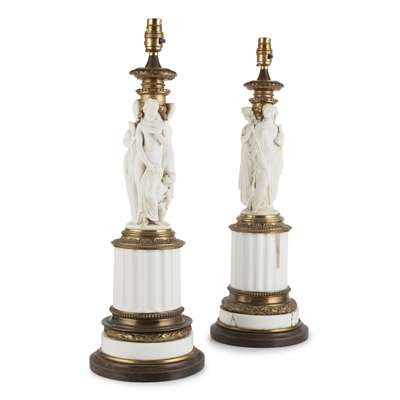 PAIR OF FRENCH FIGURAL BISQUE AND GLAZED PORCELAIN LAMPS