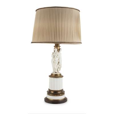 the bisque figures of Minerva, Venus, Cupid and Juno, standing on glazed white porcelain fluted column bases with gilt metal mounts, signed 'Pradier', converted to electricity; with pleated drum shades