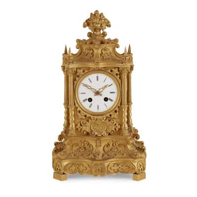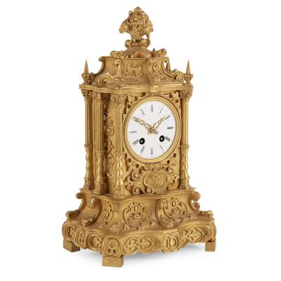 the white enamel Roman numeral dial with two winding holes, in a Baroque style gilt metal case with a flower basket finial, the movement stamped RAINGO A PARIS, 372 and 53, the case also stamped 372