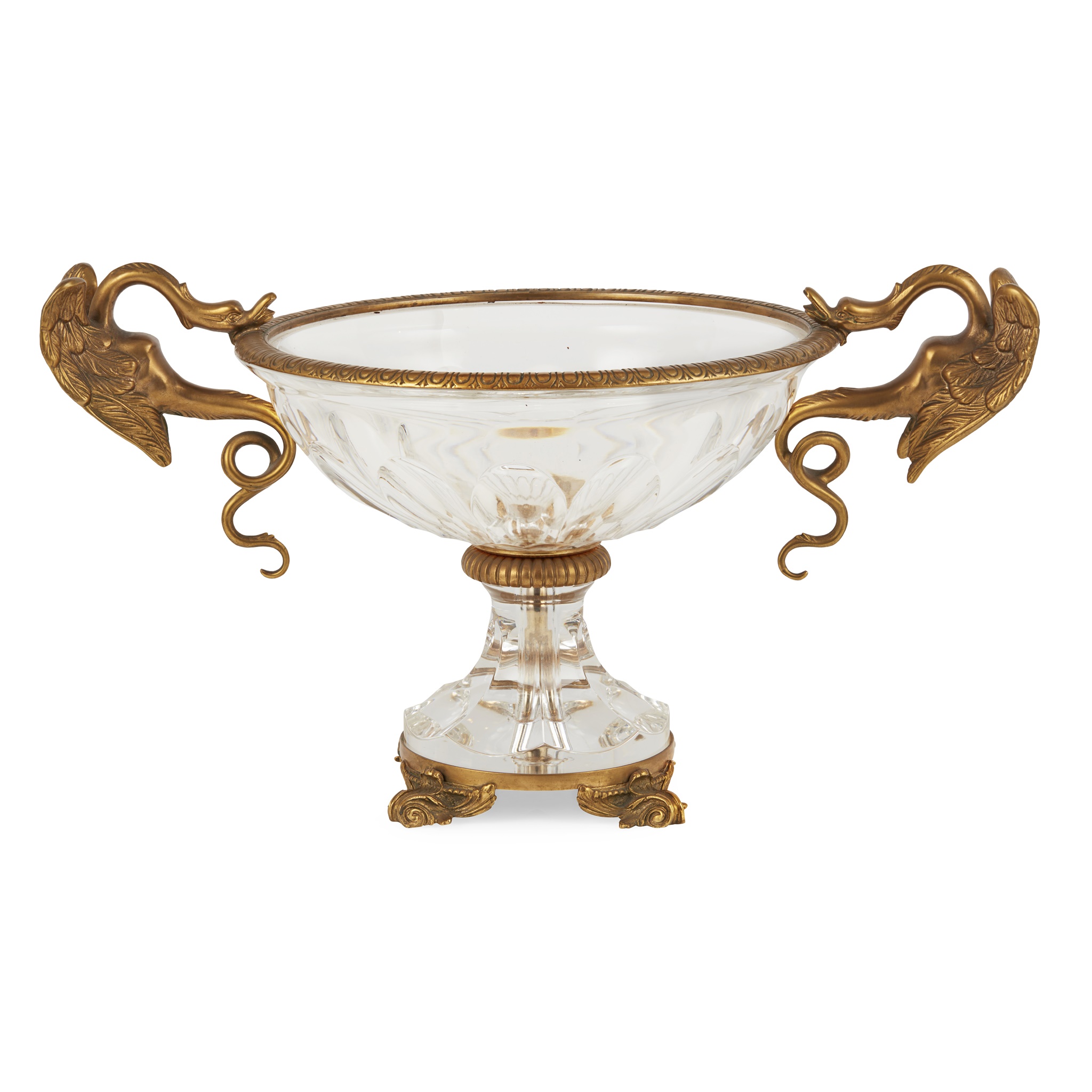 the heavy lobed glass dish mounted with winged serpent handles, on a faceted socle base and gilt metal scroll feet