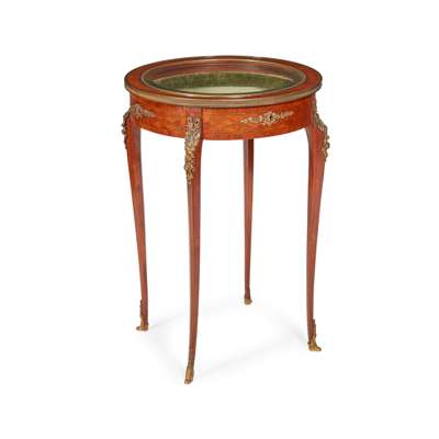 the circular hinged top with bevelled glass opening to a green plush lined interior, above a frieze with gilt bronze mounts and raised on square cabriole legs mounted with laurel wreaths and flower garlands and ending in sabots