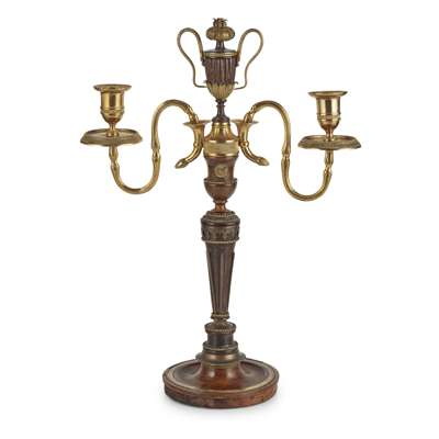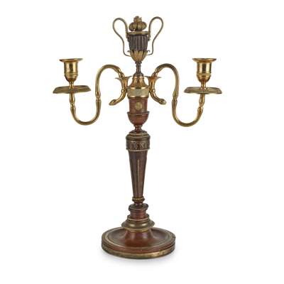 Clock 30cm wide, 66cm high, 19cm deep; candelabra 42.5cm high