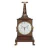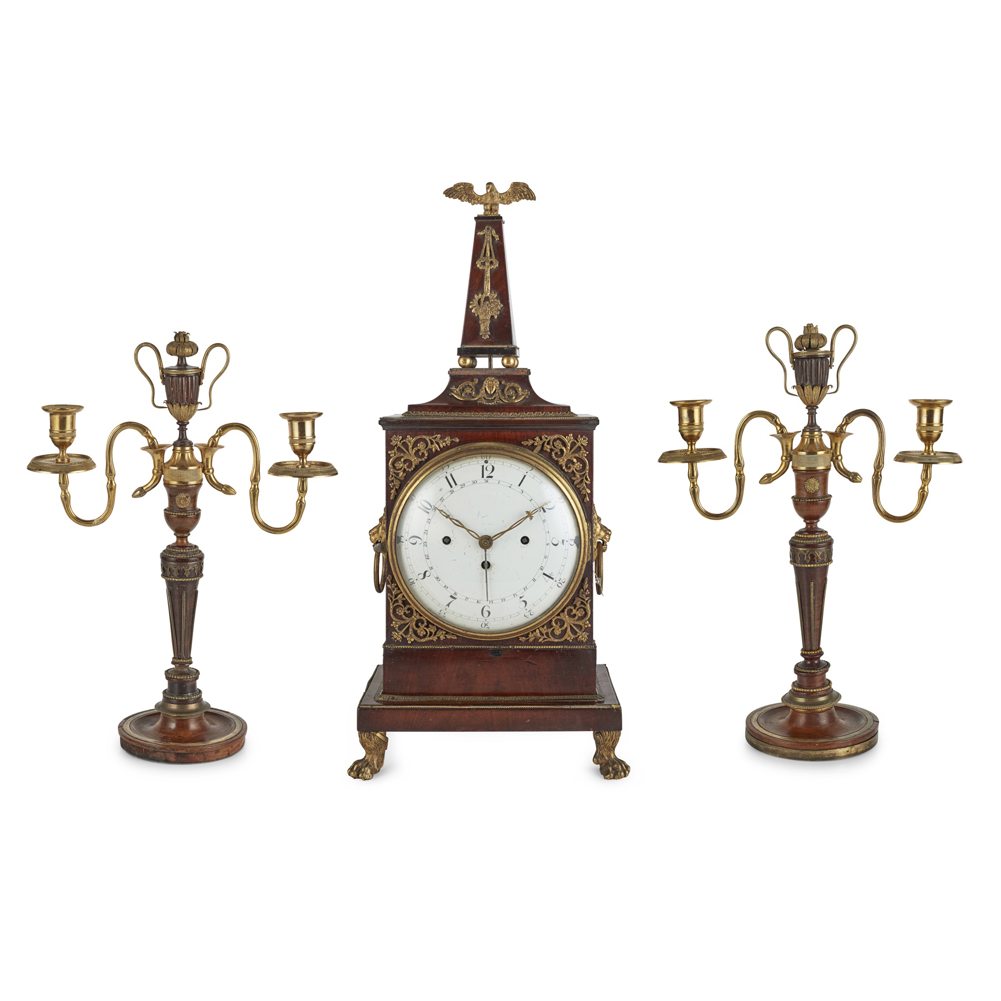 the white enamel Arabic number dial with seconds, hours, and date chapters and three winding holes, in a rectangular case surmounted by an obelisk with an eagle finial; the whole with neoclassical mounts and lion mask ring handles, raised on brass hairy paw feet; the movement striking on two bells; together with a pair of mahogany candlesticks with twin gilt brass candle arms and nozzles centred by a mahogany gilt metal mounted urn