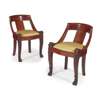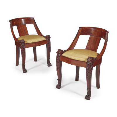 the low curved backs above drop-in seats raised on square cabriole legs carved with lions' heads and acanthus and ending in paw feet