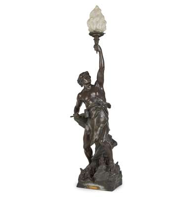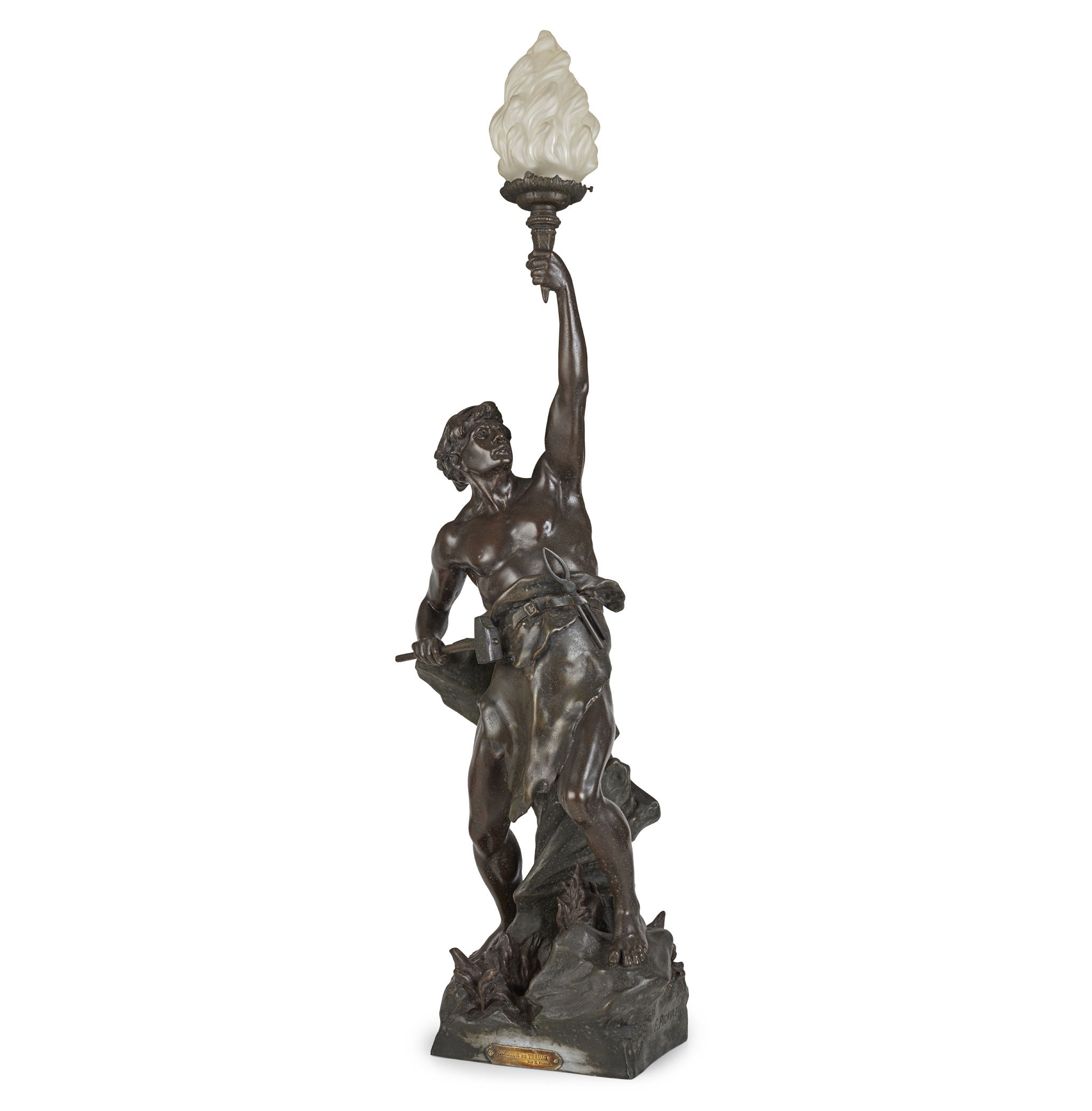 modelled as a blacksmith holding a torch with a frosted glass shade, signed E. PICAULT., and mounted with a plaque inscribed 'L'ONNEUR au TRAVAIL', and a 'Fabrication Francaises' foundry stamp, wired for electricty
