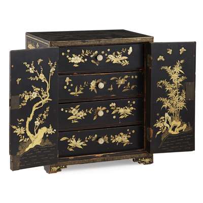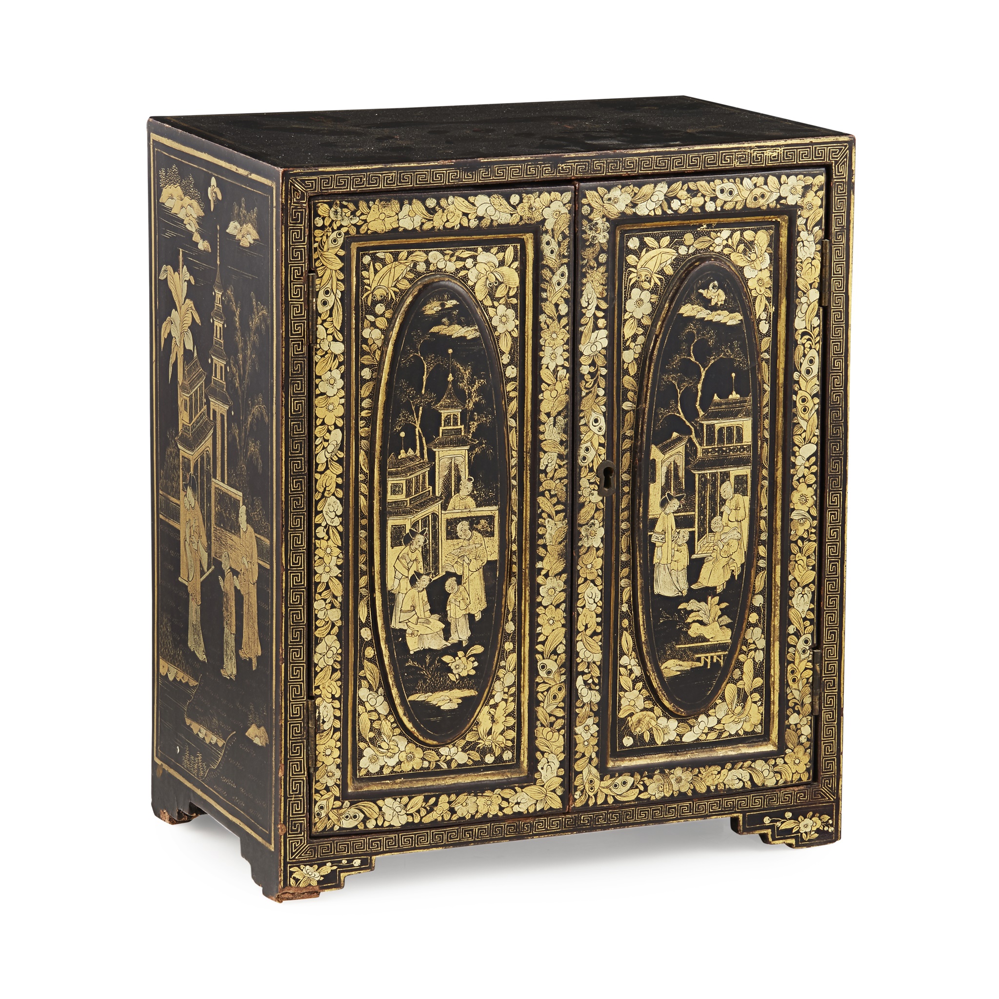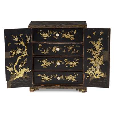 with a pair of raised panel doors opening to five drawers with turned ivory handles, decorated throughout in gilt with scenes with figures, pavilions, trees and flowers on a black ground, on bracket feet