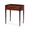 the divided hinged top opening to an arrangement of covered compartments with metal liners, a hinged easel mirror with ratchet, and open wells, above a dummy drawer and long drawer, raised on square tapered legs ending in leather castors