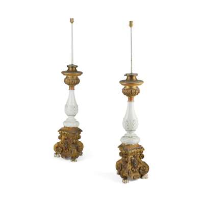 with foliate carving, the white ceramic columns with leaf mouldings, raised on triform giltwood bases carved with flowers and armorials, terminating in paw feet; later converted to electricity