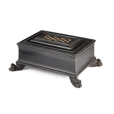 of rectangular form, the moulded top enclosing a parquetry panel of bone and specimen woods, opening to a void interior, raised on carved hairy paw feet