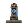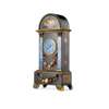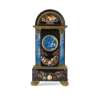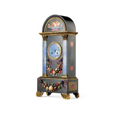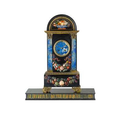 the lapis lazuli circular dial with Roman number chapters, in an arched black marble case with corresponding lapis lazuli pilasters, the pediment inlaid in high relief pietra dura with an urn of fruit, and again to the base with ribbon-tied garlands of fruit, the whole with gilt bronze mounts, with a twin-train eight-day movement, signed with engraved script to the backplate HUNZIKER; on an associated EBONISED AND FELDSPAR-INLAID STAND