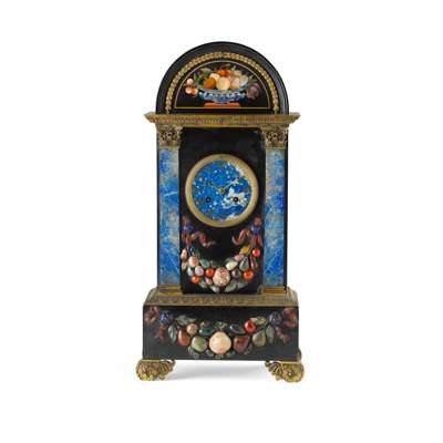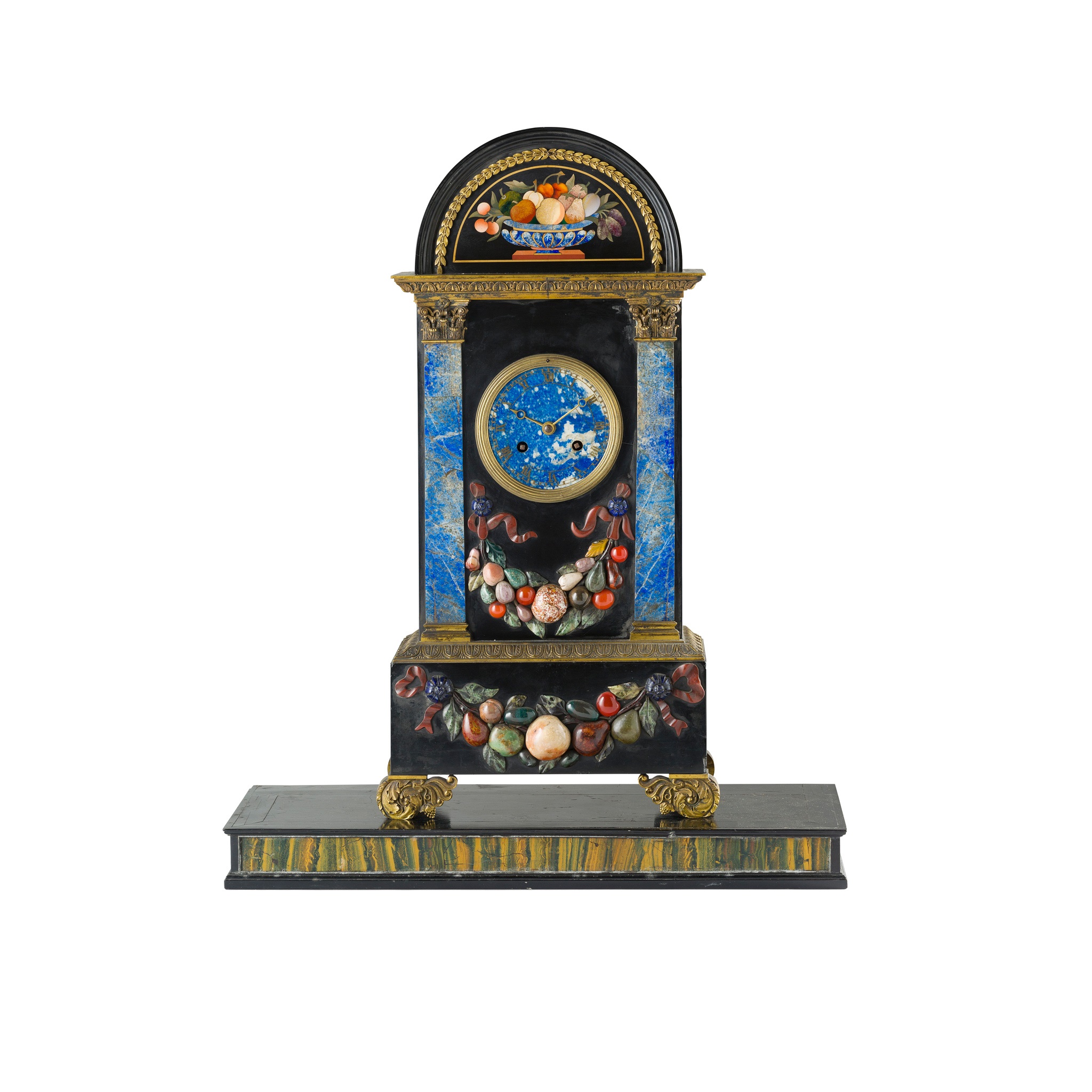 FRENCH FLORENTINE MARBLE AND PIETRA DURA MANTEL CLOCK, BY HUNZIKER, PARIS