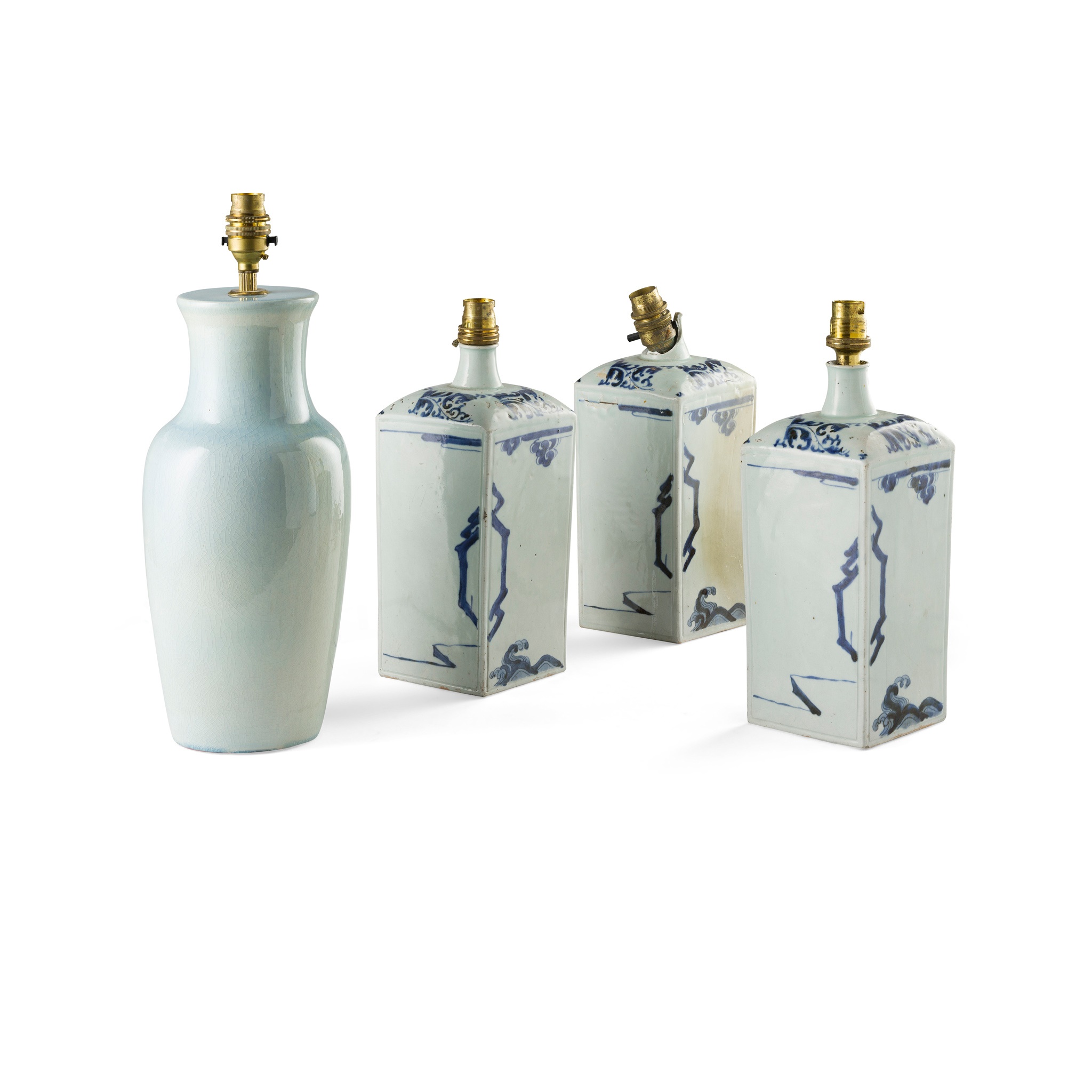 of square shouldered form, wired for electricity; together with a MODERN CELADON GLAZED LAMP, of baluster form, 32cm (excluding fittings)