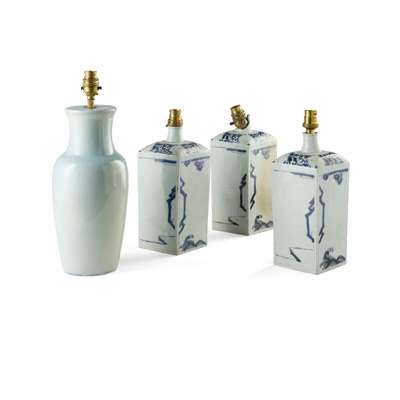 THREE CHINESE BLUE AND WHITE CERAMIC LAMPS