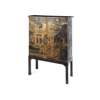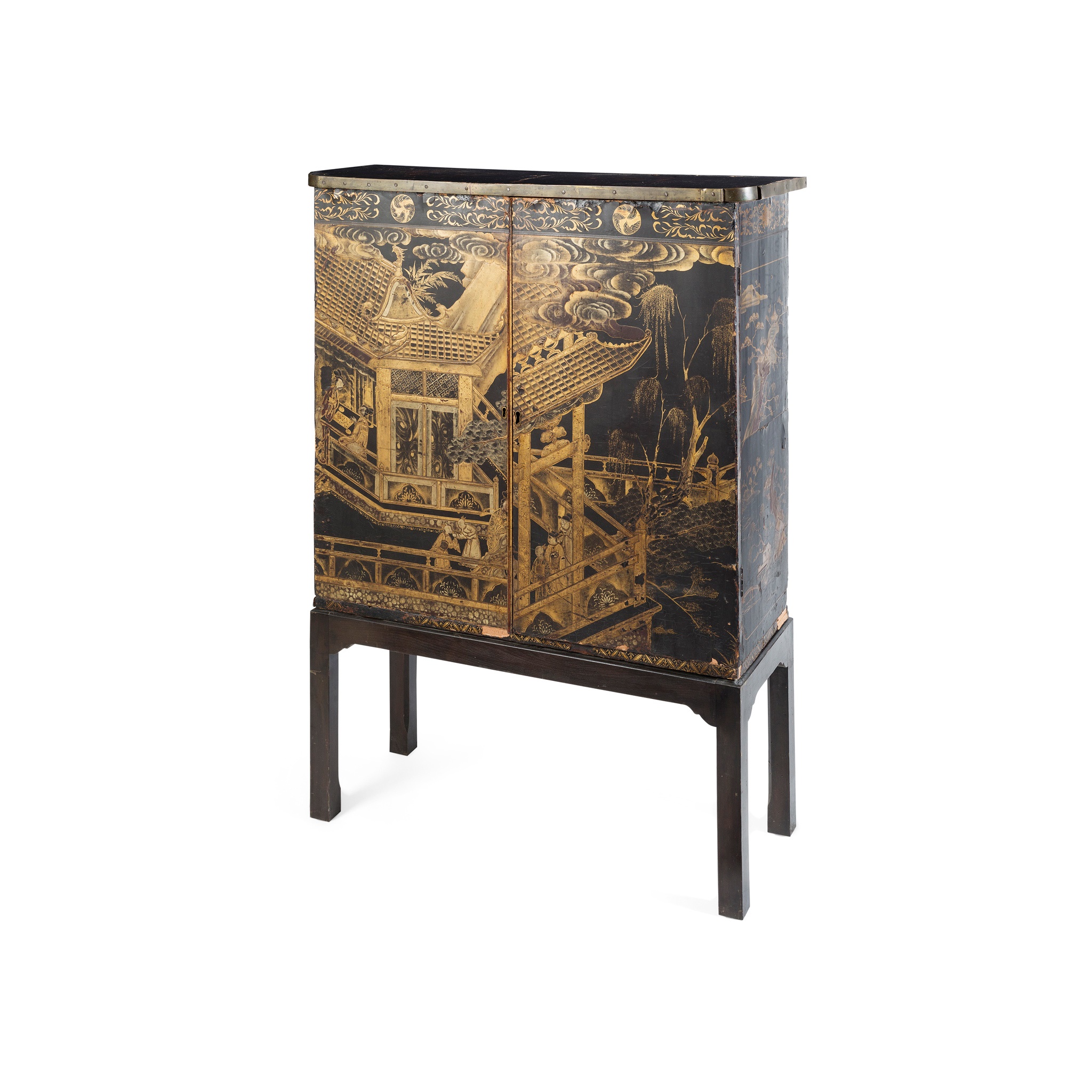 the brass banded cornice above a pair of doors decorated with Chinese figures in a domestic scene, the top and sides with landscape scenes, on a plain ebonised stand