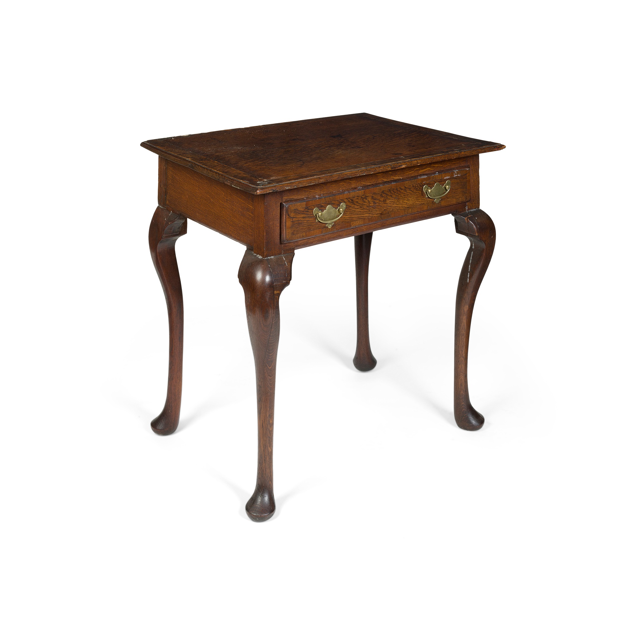 the rectangular top above a single drawer, raised on cabriole legs with pad feet