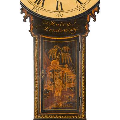 the single-train eight-day movement with cream painted Roman numeral dial, the trunk decorated with a Chinoiserie scene of two figures by a pagoda, inscribed HALEY, LONDON
