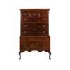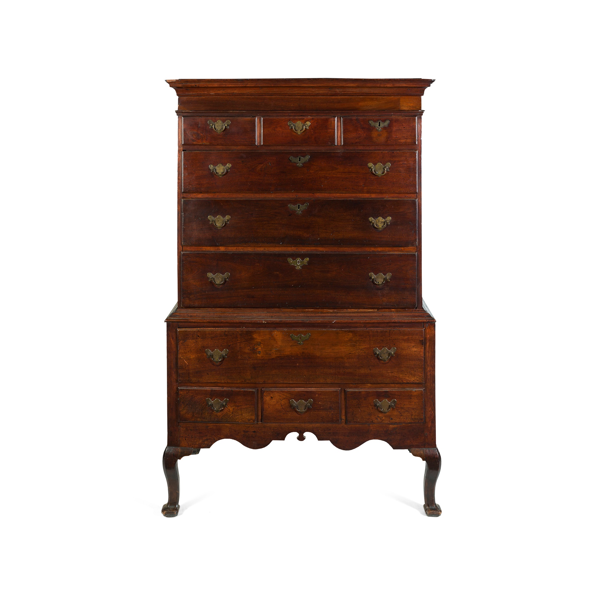 the moulded cornice above three short and three long drawers, the lower section with one long and three short drawers above a shaped apron, raised on cabriole legs with pointed pad feet
