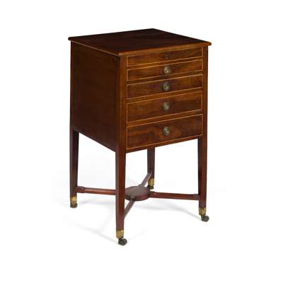 with a dummy drawer and three graduated drawers outlined with stringing, raised on square section legs, linked by chamfered cross stretchers centred by a roundel, with brass caps and leather castors,