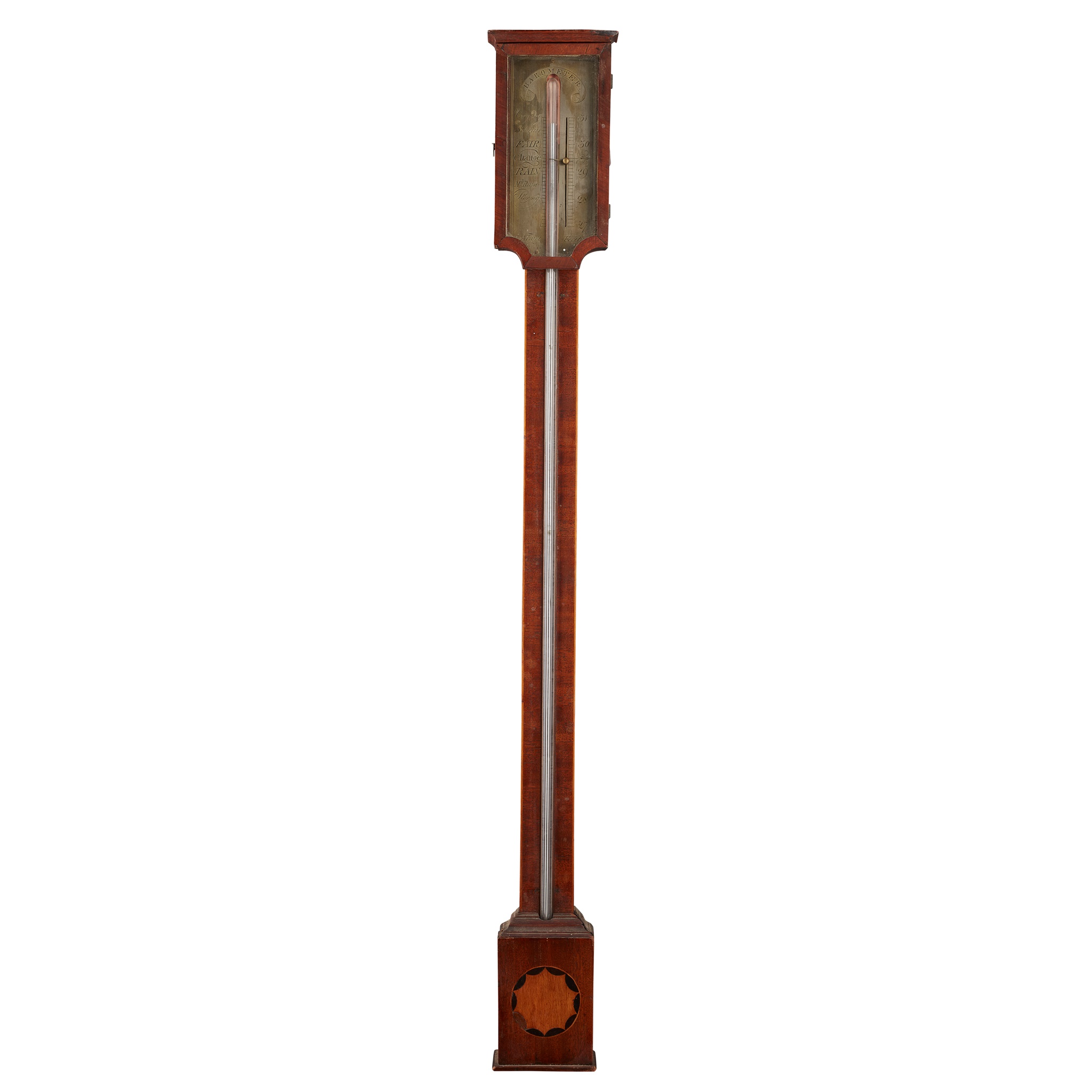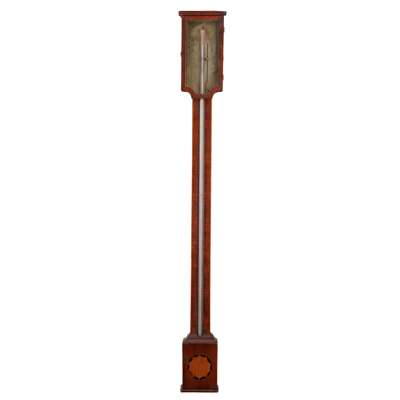 the signed silvered register plate with a mercury thermometer and main scale with manual vernier, inscribed A. LOVI FECIT, the long trunk with moulded edge and visible tube, terminating in an inlaid square cistern cover
