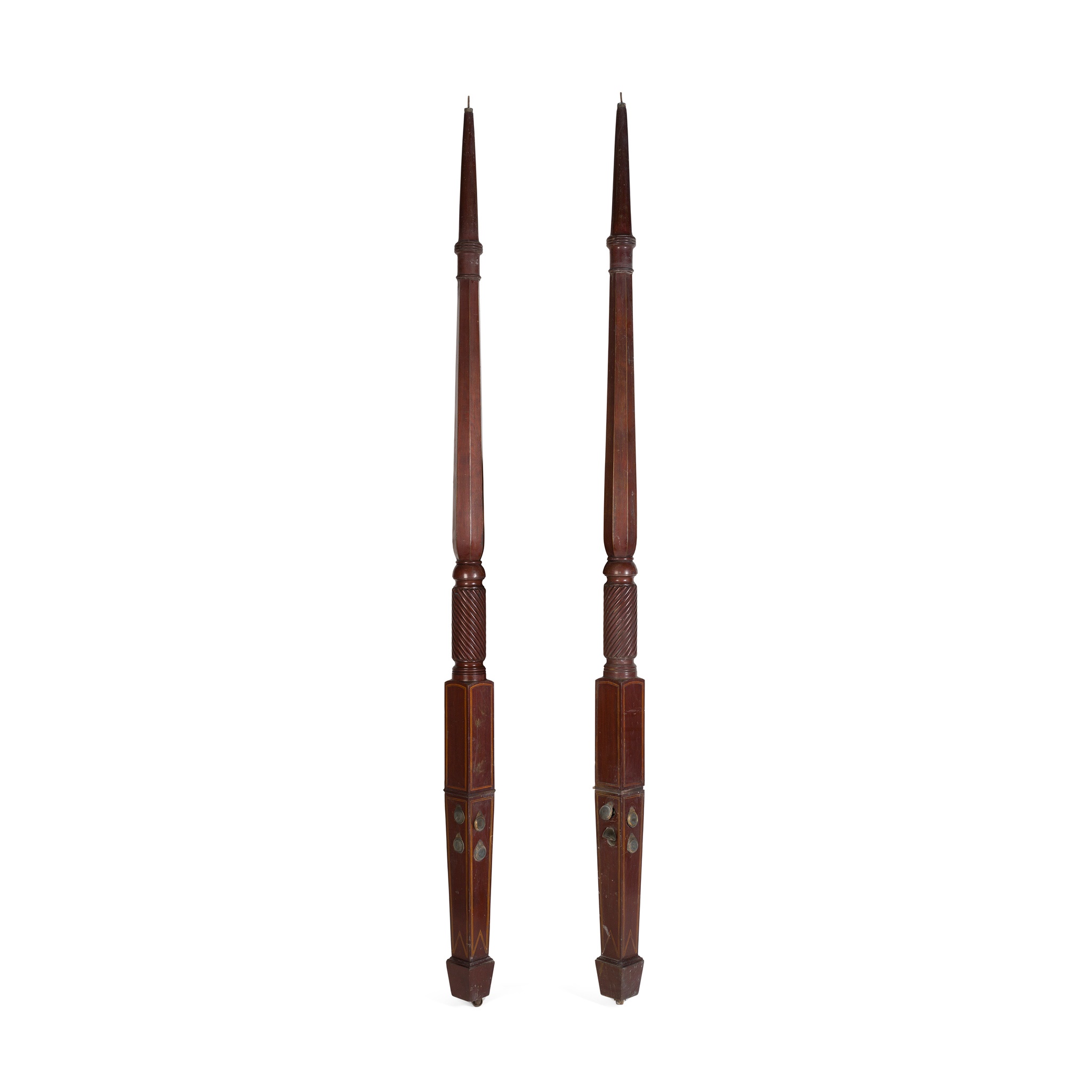 each with tapering ring-turned, faceted and spiral twist columns, above square section and inlaid bases, ending on spade feet with castors