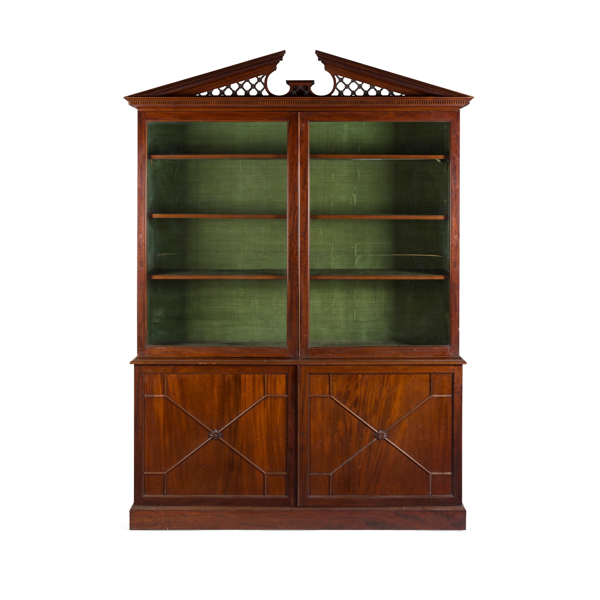 the broken pediment with dentil moulding trellis panels above a moulded cornice and twin glazed doors enclosing a green plush-lined shelved interior, the lower section with two further doors with X mouldings, enclosing shelves, on a plinth base