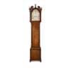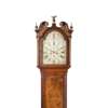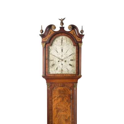 the arched silvered dial with Roman and Arabic numerals, and subsidiary dials for seconds, date, and Strike/Silent, inscribed in the arch JAMES SMITH EDINBURGH, the hood with swan-neck pediment and fret-carving, above a shaped trunk door flanked by fluted quarter columns and brass terminals, raised on a crossbanded plinth base, with bracket feet; the twin-train eight-day movement striking a bell