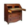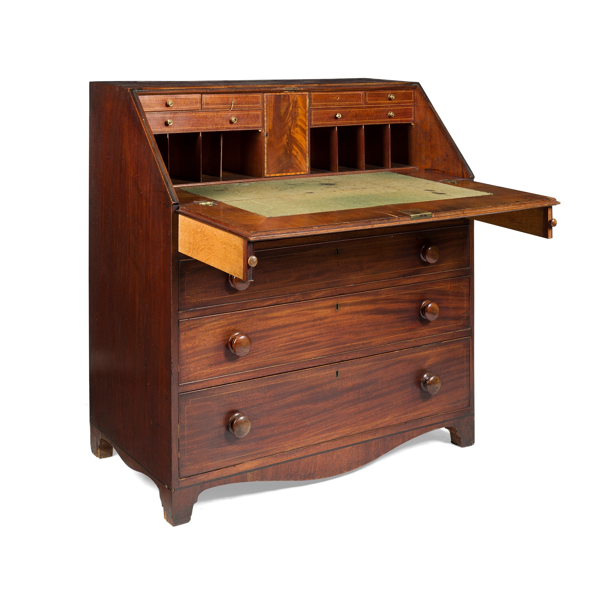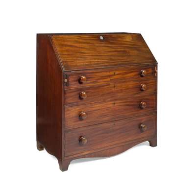 the slant front enclosing a fitted interior with pigeon holes and drawers, above four long graduated drawers and a shaped apron, raised on bracket feet
